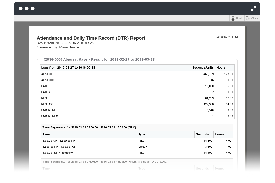 All attendance and leave attribution reports generated by HRTeamware™ are based on the following: the existence of an applicable schedule and the presence of attendance logs or leaves. HRTeamware™ uses these items to calculate, on-demand, the attributable attendance (in seconds) and its appropriate type(e.g. be it Regular Schedule or Regular Schedule with Rendered Overtime). Employees, Supervisors and the HR department can easily see the basis of the summarized Daily Time Records (DTR) so issues due to scheduling and other human-factors can be easily identified and rectified prior to payroll cut-off.