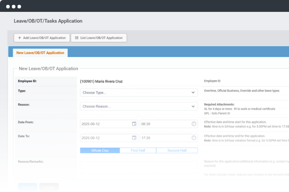 Filing leaves, OB, OT etc in HRTeamware™ is easy.
