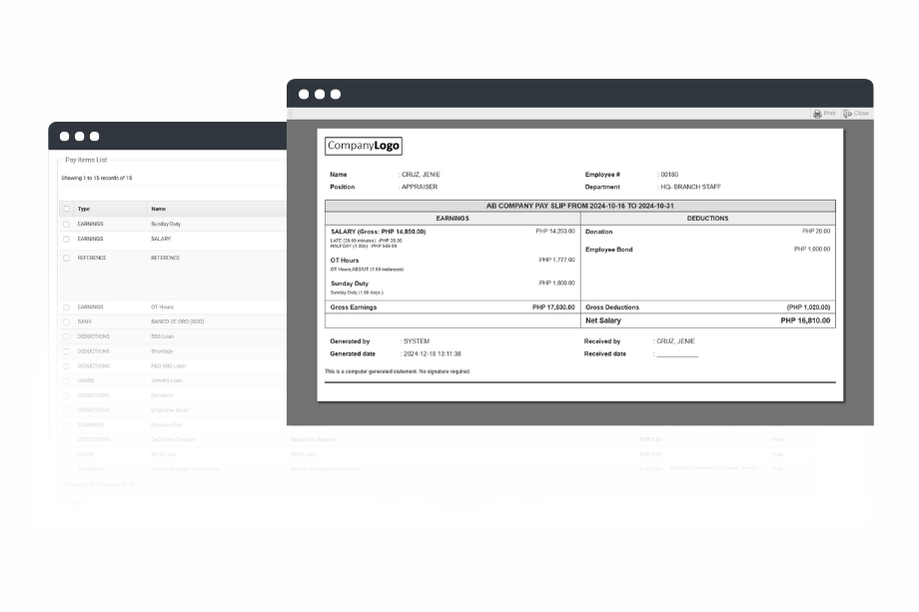 Payroll Automation simplifies one of the most complex HR functions by seamlessly integrating time, attendance, and compensation data into a unified system. Daily Time Records (DTRs) are generated on-demand, reducing manual errors and saving hours of administrative work. These records feed directly into the built-in Payroll module or can be exported for integration with your preferred payroll provider. The module also links with Compensation & Benefits and Loans Management, ensuring that allowances, deductions, and loan repayments are all factored in accurately. With streamlined workflows and customizable rules, HR teams can easily manage payroll cycles while ensuring compliance and transparency. Employees benefit from timely, accurate, and hassle-free salary disbursements, while organizations gain a scalable solution that adapts to evolving payroll needs.